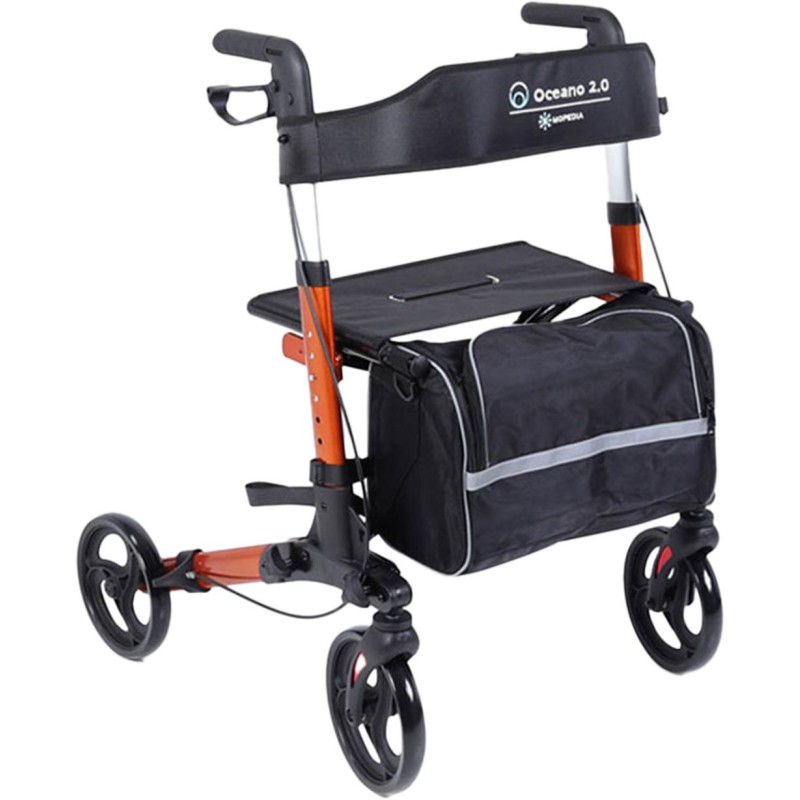 4 ruote da Ø 20 cm, le frontali piroettanti con forca completa di catarifrangente e le posteriori fisse. Dotato di freni a doppia funzione sulle ruote posteriori. Impugnature anatomiche regolabili in altezza per il massimo comfort complete di catarifrangente. Completamente pieghevole per essere trasportato e riposto in pochissimo spazio. Completo di seduta, schienale, borsa e portabastone/stampella.
