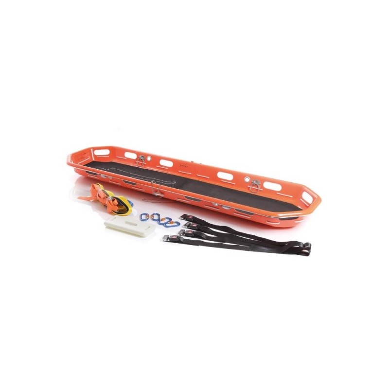 La barella è divisibile in due parti, il che la rende compatta e facile da trasportare. Dotata di cinture di sicurezza, materassino non assorbente e poggiapiedi. Grazie all'imbracatura in dotazione la barella è ideale per il sollevamento e il trasporto con elicottero.
