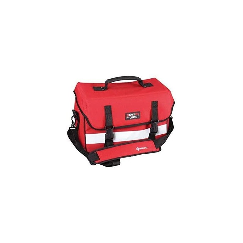 Borsa per emergenza e primo soccorso realizzata in materiale antistrappo facilmente trasportabile. Apertura superiore a cerniera. Alloggiamenti modulabili grazie ai due divisori facilmente fissabili attraverso due strisce in velcro. Completo di 2 tasche in rete. Trasportabile a mano o a tracolla. Completa di striscia anteriore in materiale riflettente e piedini di sicurezza antiscivolo.