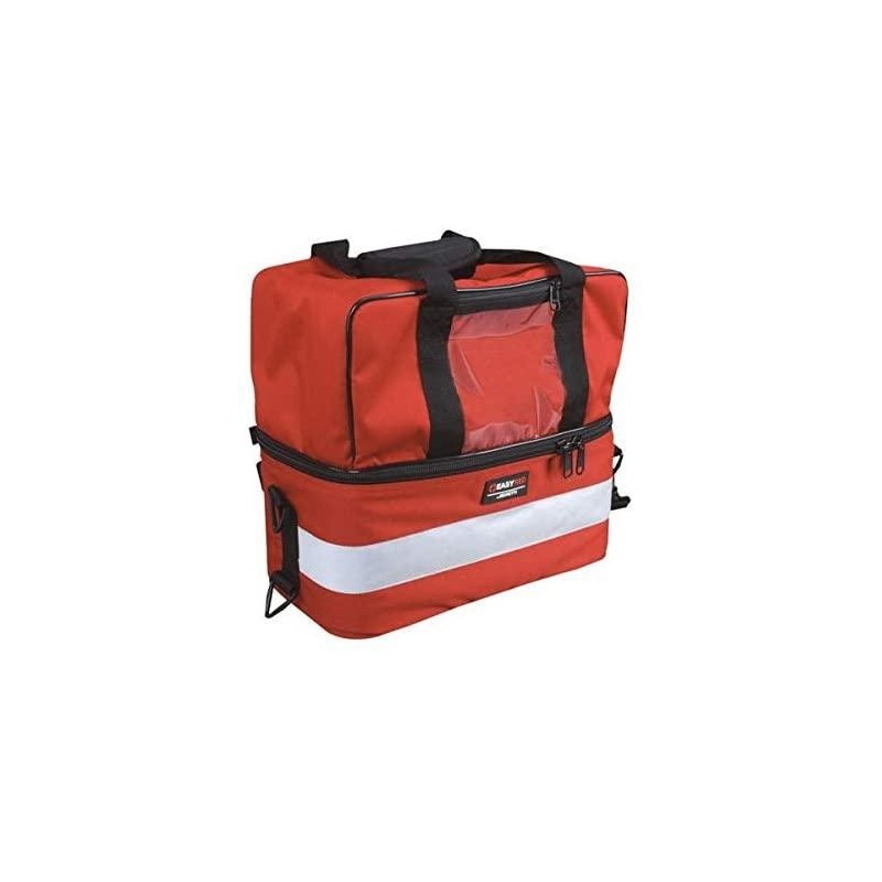 Borsa per emergenza e primo soccorso realizzata in materiale antistrappo a due sezioni. Cerniera a doppia apertura. L’interno è predisposto per l’inserimento delle buste multiuso trasparenti con o senza fissaggio in velcro. Completo di alloggiamenti ad elastici per materiale di piccole dimensioni. Dotato di finestra trasparente sulla parte frontale e sulla parte posteriore per l’inserimento del logo dell’associazione di appartenenza. Trasportabile a mano o a tracolla. Completa di strisce anteriori e laterali in materiale riflettente e piedini di sicurezza antiscivolo.