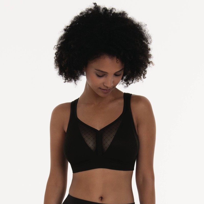 Oltre al reggiseno soft e al reggiseno con ferretto, la serie EVE ora si arricchisce anche con il nuovo reggiseno soft con coppa e ulteriori dettagli speciali: l’ampio ponticello e la fascia sottoseno inserita garantiscono una tenuta perfetta. Il décolleté più alto e chiuso e la coppa traspirante DeltaPad offrono al seno il supporto ideale e sicurezza durante il movimento. Il delicato tulle nella coppa preformata con motivi grafici a rombi si fa notare per le linee definite. Il décolleté è incorniciato da inserti morbidi e senza fronzoli. La schiena in powertulle è doppia nelle taglie più grandi e presenta lateralmente un rinforzo grazie alla fodera non elastica.
