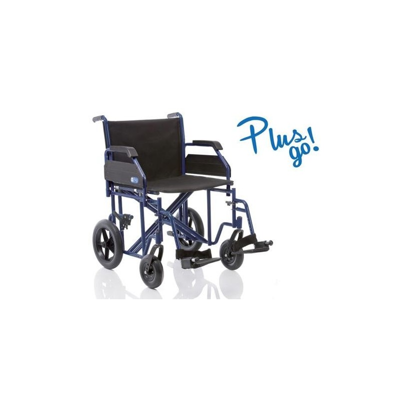 Telaio stabilizzante in acciaio verniciato, DOPPIA crociera, seduta e schienale in nylon nero imbottito e lavabile, tasca porta documenti sul retro. Ruote posteriori (Ø 32 cm) con razzi in plastica, gomme nere solide. Ruote anteriori nere in PU (Ø 20 cm – spessore 5 cm) con forcella in acciaio con fori per la regolazione della ruota. Braccioli corti estraibili con imbottitura in PU. Pedane estraibili regolabili in lunghezza con poggia piedi in plastica nera e cinturino ferma-tallone.