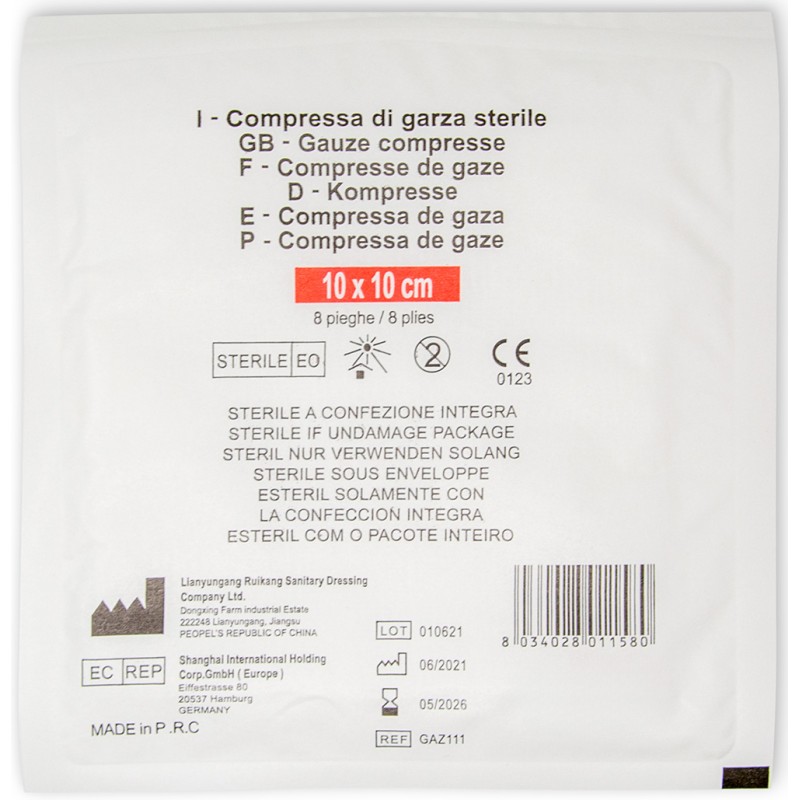 GAZ194: Busta di garza compressa sterile 18x40 cm piegata senza filo. Questa garza, piegata, misura 9.5x5 cm