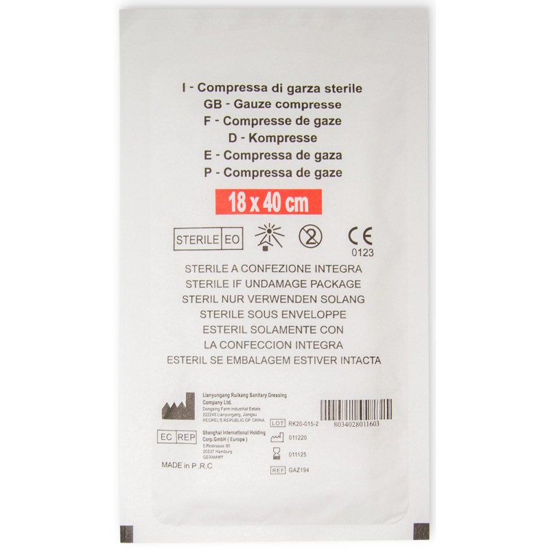 Confezione da 12 compresse di garza idrofila sterile 18x40 cm. REPERTORIO DISPOSITIVI MEDICI Ministero della Salute nr.37918R CND M0201020101