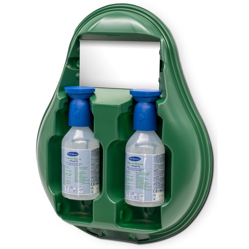 Prima stazione di lavaggio oculare d’emergenza in Italia e nel mondo con questo design innovativo, composta da 2 flaconi di soluzione sterile a PH neutro da 250 ml, supporto termoformato con parte frontale trasparente con chiusura antipolvere, dotato di specchietto e fornito con viti e tasselli per l’applicazione a parete.