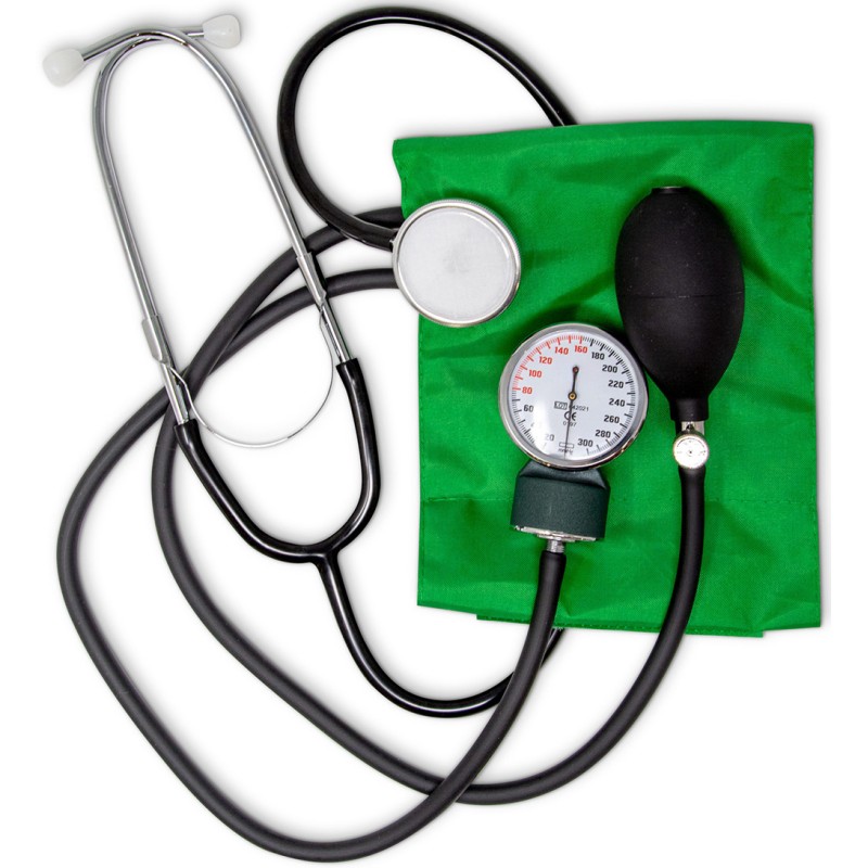 Sfigmomanometro aneroide con fonendoscopio con bracciale in nylon con chiusura a velcro. Fonendoscopio a testa piatta fissato sul bracciale, custodia in similpelle con cerniera.