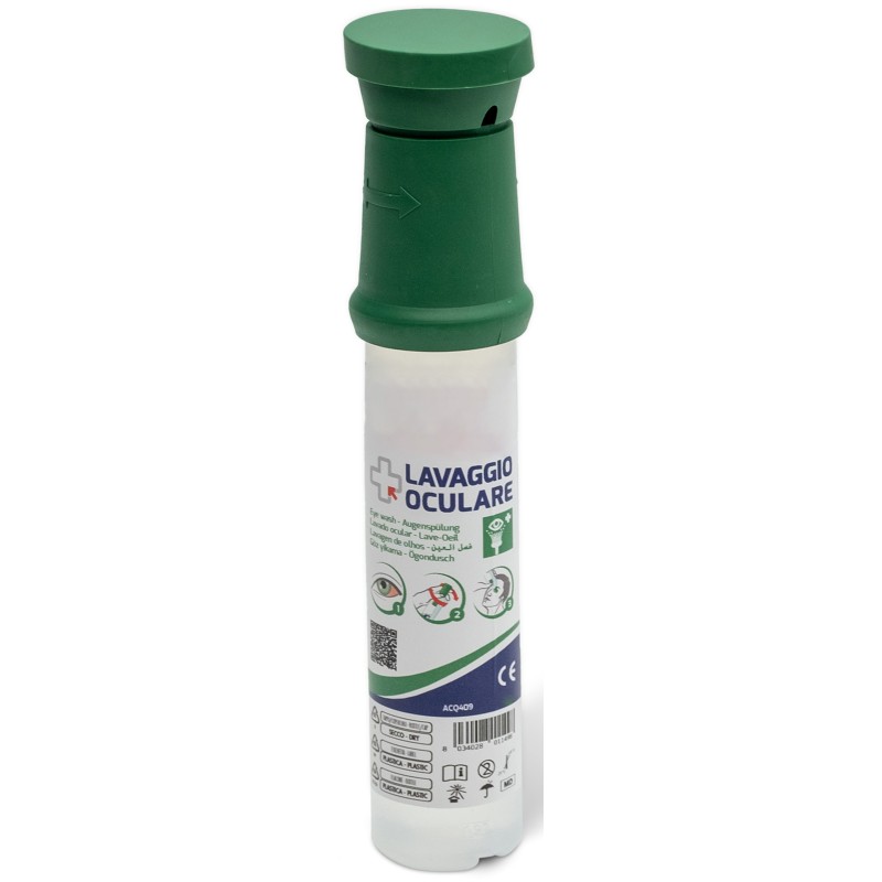 Soluzione monouso, sterile di cloruro di sodio 0,9% per il lavaggio oculare d’emergenza. Per l’utilizzo basta applicare il tappo sopra il flacone e girarlo i senso orario in modo da rompere la protezione. Il flacone è pronto all’uso e munito di tappo. ACQ414 è idoneo come ricambio per la stazione di lavaggio oculare DROP (CPS202).