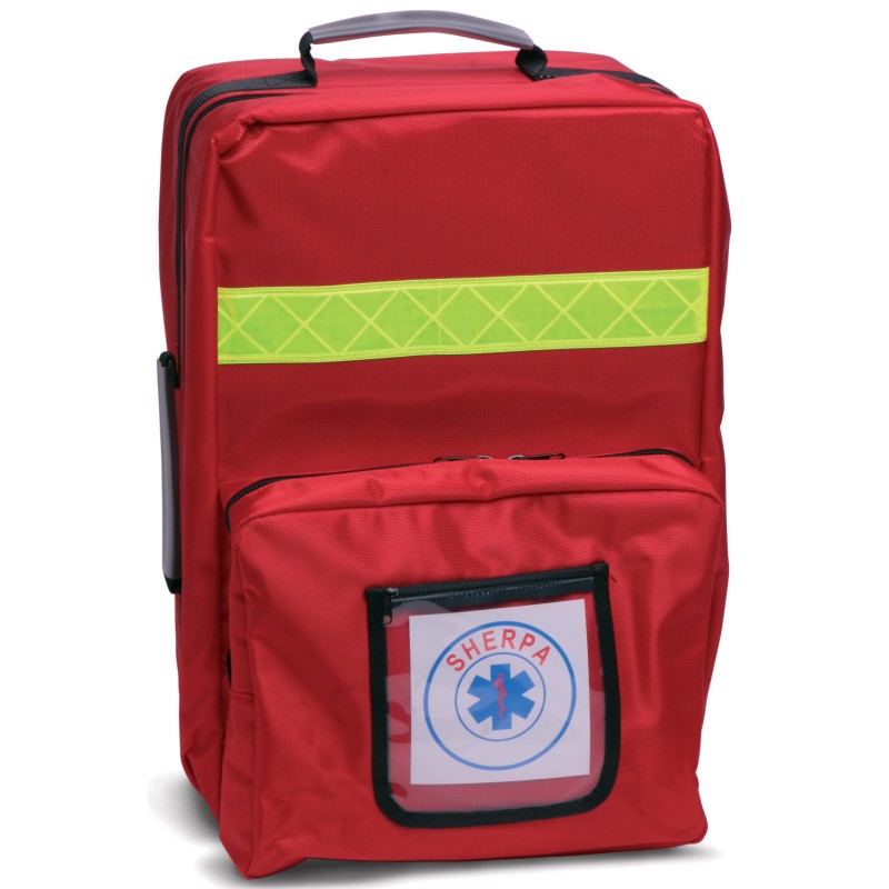 Zaino in nylon ad alta resistenza, impermeabile, con banda riflettente, 2 comparti di cui uno esterno e 1 interno comprendente 4 borsette in nylon di colori diversi per un razionale alloggiamento dei presidi e finestrelle in materiale plastico trasparente per una rapida visualizzazione del contenuto, 2 spallacci (a scomparsa in apposito alloggiamento nel retro dello zaino).