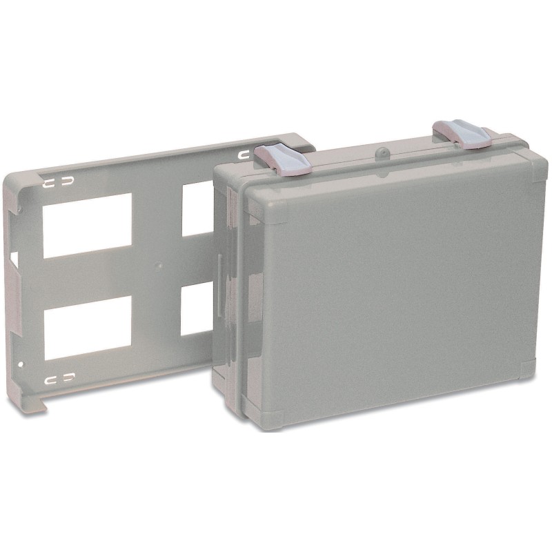 Contenitore realizzato in ABS composto da due parti uguali ciascuna completa di vetri e separatori per un migliore alloggiamento dei prodotti. Dotata di supporto per attacco a parete e chiusura con due clips rotanti. Tenuta ermetica garantita da una guarnizione in neoprene. Disponibile in tre colori: CAV043 arancio CAV143 bianco CAV144 verde Dimensioni (L x P x H): 235x200x87 mm Peso a vuoto: 0,75 kg