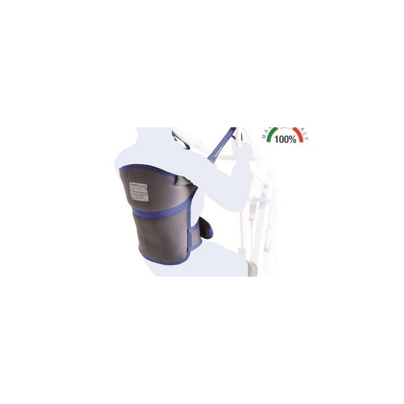 Imbracatura per l'utilizzo con il metti in piedi. Realizzata e cucita interamente in tessuto, nastro e filo 100% poliestere. Il tessuto è antistrappo e altamente traspirante. Il disegno avvolgente per la schiena del paziente, con la cintura addominale a chiusura velcro e la particolare posizione dei punti di trazione sono stati progettati in modo da dare il maggior sostegno ed il minimo disagio durante il sollevamento dalla posizione seduta alla posizione eretta senza pressioni nella zona sottoascellare.