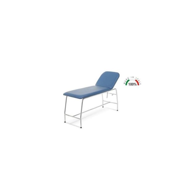 Letto da visita medica, struttura in tubolare di acciaio cromato rotondo Ø 35mm, gambe Ø 30mm dal montaggio facile e veloce. Schienale regolabile e rivestimento in similpelle lavabile.