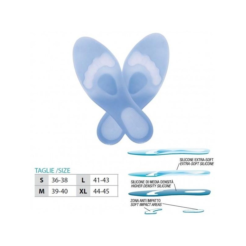 Speciale soletta realizzata con due diversi strati di silicone a densità differenziata. Il primo strato in silicone a contatto con la pianta del piede è più morbido. Il secondo, a densità maggiore, è dotato di zone di scarico che permettono di ammortizzare i punti di pressione.