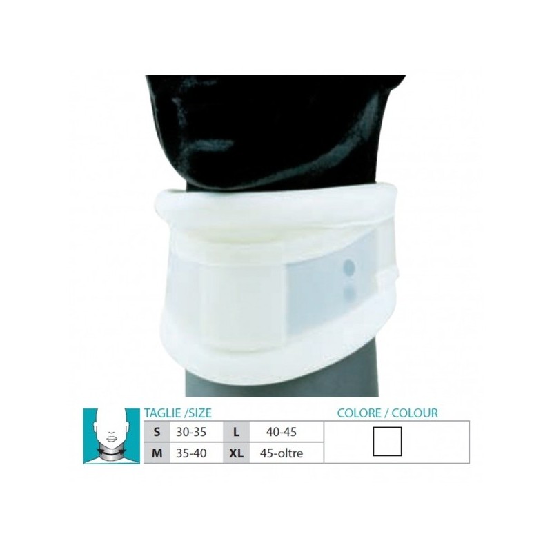 Collare cervicale rigido tipo Schanz con appoggio mentoniero. Indicazioni: Traumatismi cervicali di medià gravità. Cifosi cervicali Nevralgie cervicobrachiali. Taglie: S= 30-35 cm. M= 35-40 cm. L= 40-45 cm. XL= 45-oltre cm.