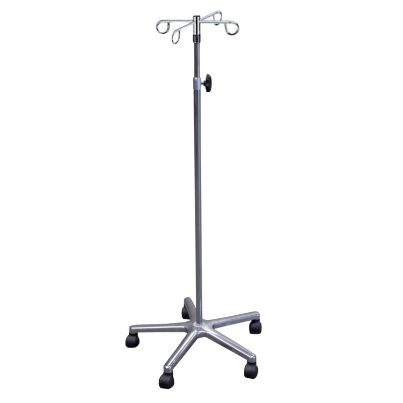Tubolare superiore regolabile una manopola con vite di bloccaggio. Dotata di quattro ganci per infusioni di farmaci e soluzioni. Base in alluminio formata da cinque razze su ruote piroettanti con sistema frenante.