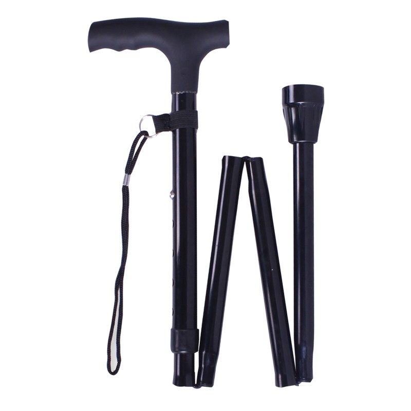 Bastone in alluminio, struttura pieghevole con impugnatura a T in plastica e cinturino di sicurezza. Facilmente regolabile, mediante spine di bloccaggio, su 5 differenti livelli di altezza da 86 ad un massimo di 96 cm. Puntale in gomma. Colore Nero. Altezza da 86 a 96 cm Portata 100 kg