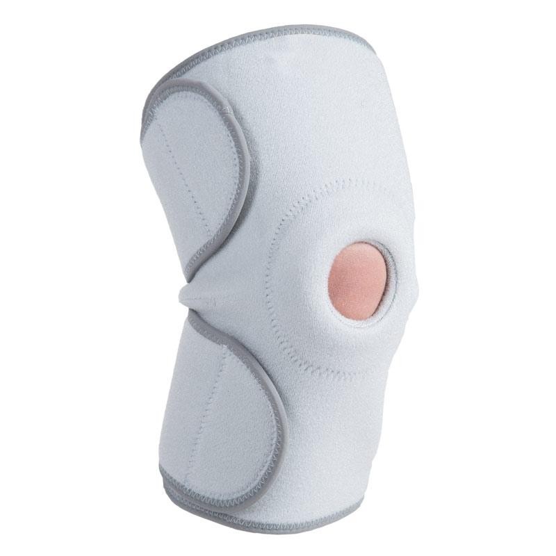 Ginocchiera contenitiva in neoprene con anello stabilizzatore e foro rotuleo, completamente aperta. Fasce di chiusura a velcro.