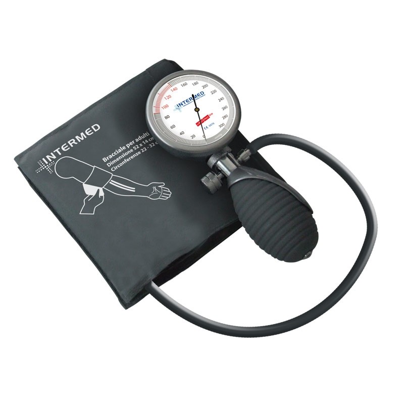 Quadrante con scala graduata a due colori, con limiti per la pressione clinica di 140/90 mmHg.
