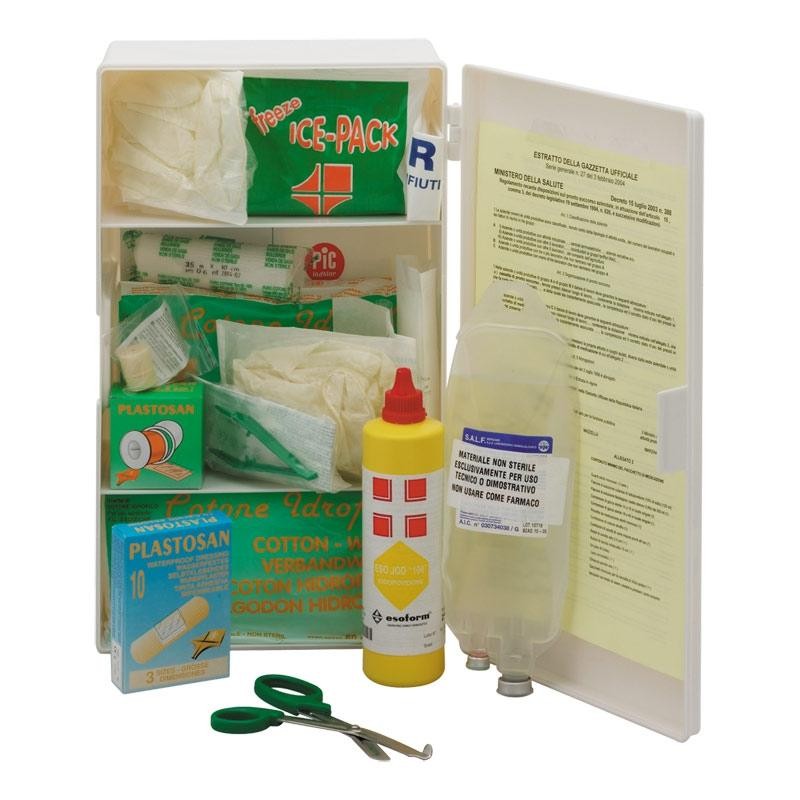 Realizzato in materiale plastico di colore bianco con 3 vani e 2 ripiani interni con chiusura a scatto. Indicato per aziende o unità produttive con meno di tre lavoratori (Gruppo C - D.M. 388 - art. 1 e art. 2 punto 5)