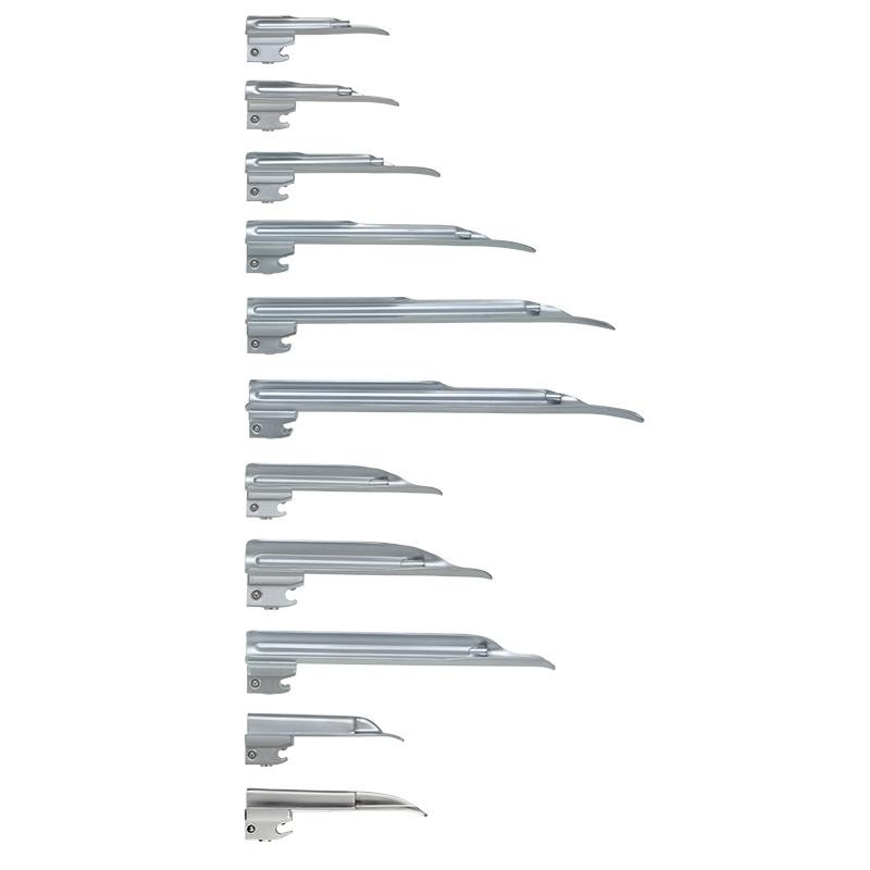 Lame per laringoscopi F.O. Heine Classic+ Miller, WIS e PaedLame in acciaio inox cromato, prive di raccordi a vite, di conduttori esterni di luce e di cavità che possono favorire il ristagno di sporco e la trasmissione di germi.
