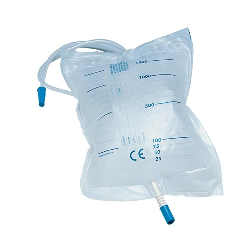 Sacche urina da letto da 2 litri con scarico e valvola antireflusso (tubo 90 cm)Sacca monouso per drenaggio urine, con scala graduata da 100 ml. realizzata in PVC morbido con superficie interna anti adesione Provvista di doppia saldatura su tutto il perimetro, con due semifori per il fissaggio. Spazio predisposto per inserimento dei dati paziente. Con tubo da 90 cm con scarico.