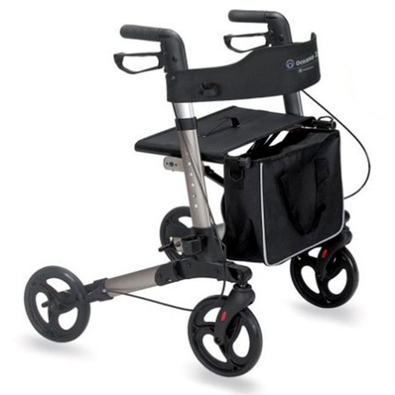 4 ruote da Ø 20 cm, le frontali piroettanti con forca completa di catarifrangente e le posteriori fisse. Dotato di freni a doppia funzione sulle ruote posteriori. Impugnature anatomiche regolabili in altezza per il massimo comfort complete di catarifrangente. Completamente pieghevole per essere trasportato e riposto in pochissimo spazio. Completo di seduta, schienale, borsa e portabastone/stampella.
