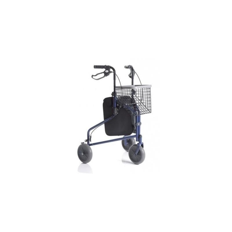 Rollator pieghevole in acciaio verniciato con tre ruote. Completo di cestino, vassoio e borsa. Porta massima: Kg. 136
