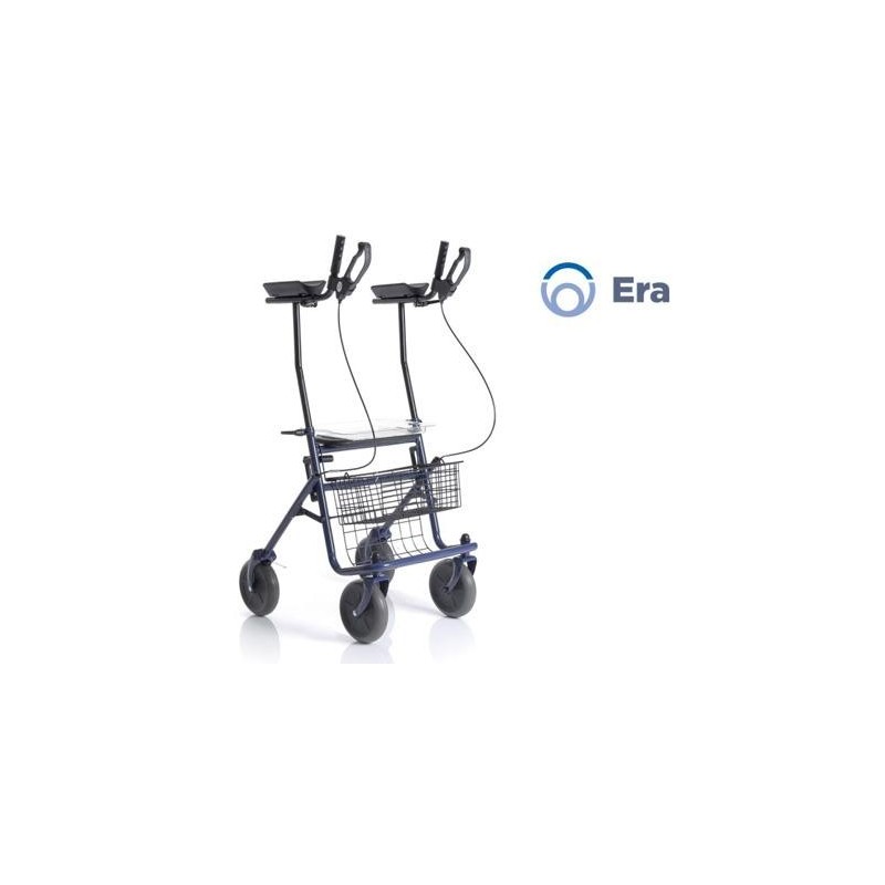4 ruote piene di Ø 20 cm. Ruote frontali piroettanti, ruote posteriori fisse. Impugnature con appoggi antibrachiali e freni doppia funzione sugli appoggi. Facilmente pieghevole per essere riposto e trasportato. Fornito con sedile, vassoio e cestino porta oggetti.
