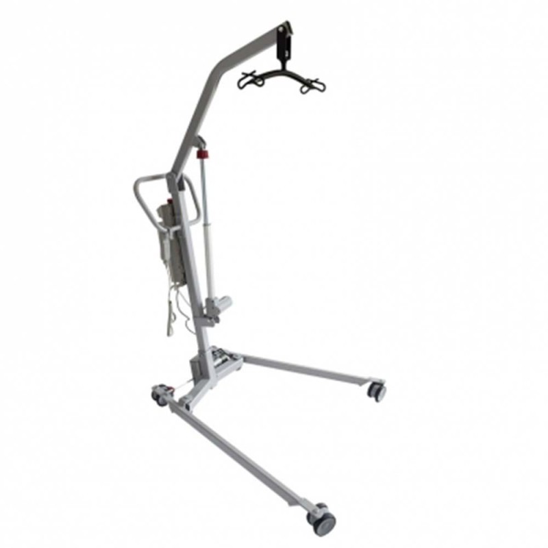 Sollevatore elettrico con struttura in acciaio, adatto anche per pazienti obesi, apertura gambemediante attuatore elettrico. Bilanciere a quattro ganci, con possibilità di prendere il paziente da terra.
