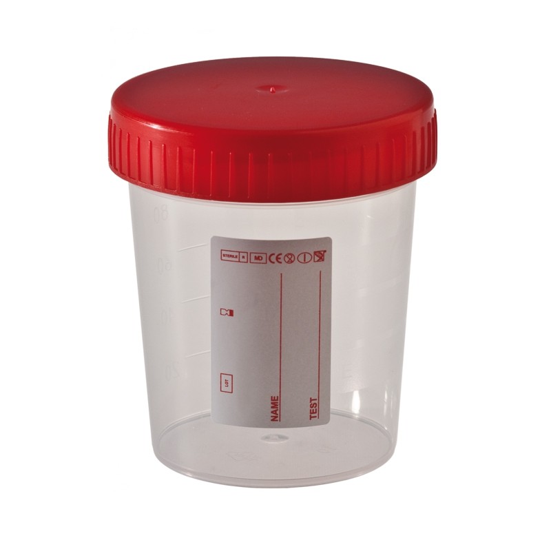 Realizzato in polipropilene trasparente. Dotato di tappo con chiusura ad avvitamento. Con superficie di scrittura dati del paziente. capacità di 120 ml. Prodotto sterile.