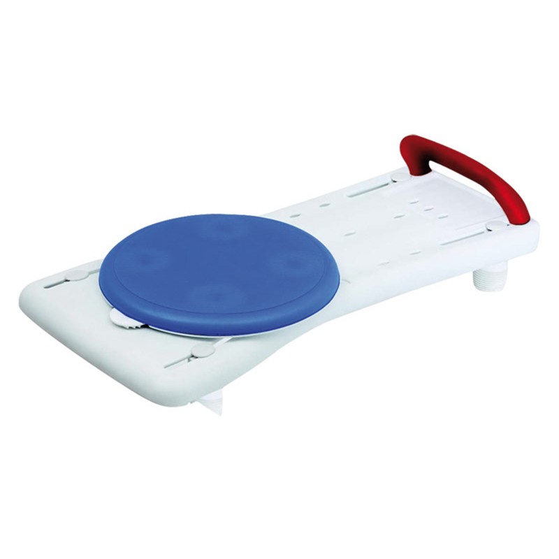Tavola da vasca con fermi di tenuta regolabili in larghezza in materiale plastico morbido antigraffio per una maggiore tenuta, con maniglia di appoggio laterale e disco rotante rivestito in poliuretano morbido, scorrevole per facilitare l’ingresso nella vasca. Ideale come sedile o asse di appoggio durante le operazioni di igiene personale.