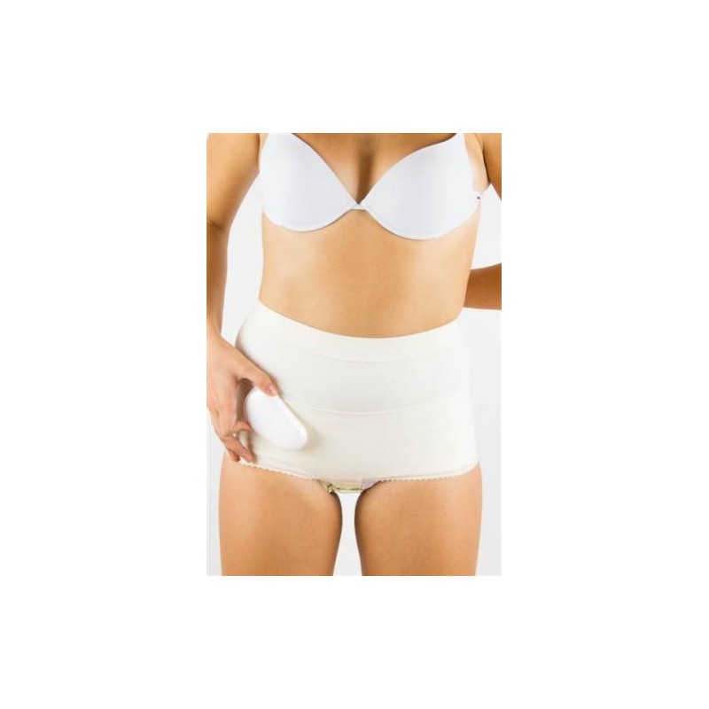 Slip erniario per donna in materiale poliestensivo, con pelotte, per la prevenzione di eventuali ernie o rilassamenti addominali in seguito ad operazioni chirurgiche. Il prodotto è dotato di un cavallo aperto e regolato da due file di gancetti.