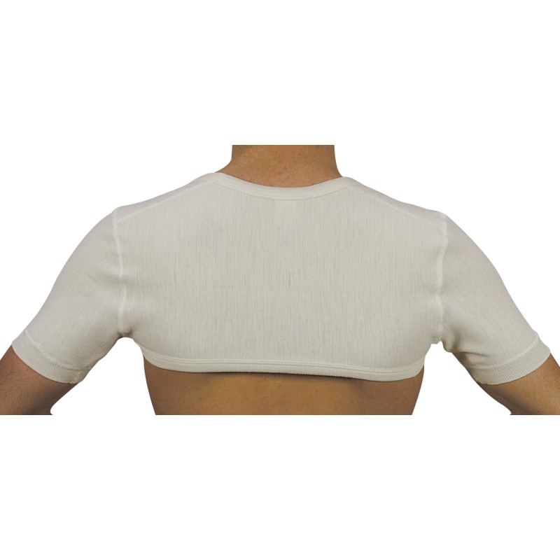 Coprispalle in lana merino di colore bianco: un prodotto anatomico che si adatta perfettamente alle spalle garantendo comfort durante l’intero utilizzo e massima efficacia.