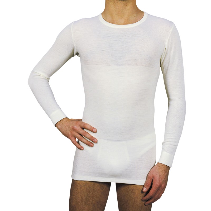 Maglia maschile a manica lunga con cintura tubolare incorporata, in funzione di sostegno. Le speciali fibre naturali di alta qualità (lana più cotone) con cui è realizzata garantiscono un prodotto ad alto isolamento termico, con assoluta libertà di movimento ed elevata vestibilità.
