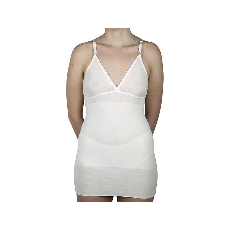 Maglia femminile con cintura tubolare incorporata di sostegno in lana e cotone, con benefici a stomaco e reni. Spalline strette e regolabili per offrire il massimo comfort durante l’uso, scollo a V.