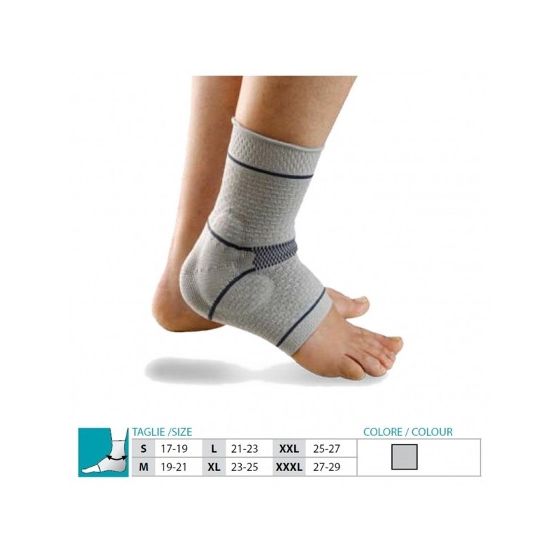 Cavigliera con inserti malleolari, realizzata in un particolare tessuto a maglia elastica con all'interno inserti malleolari sagomati.