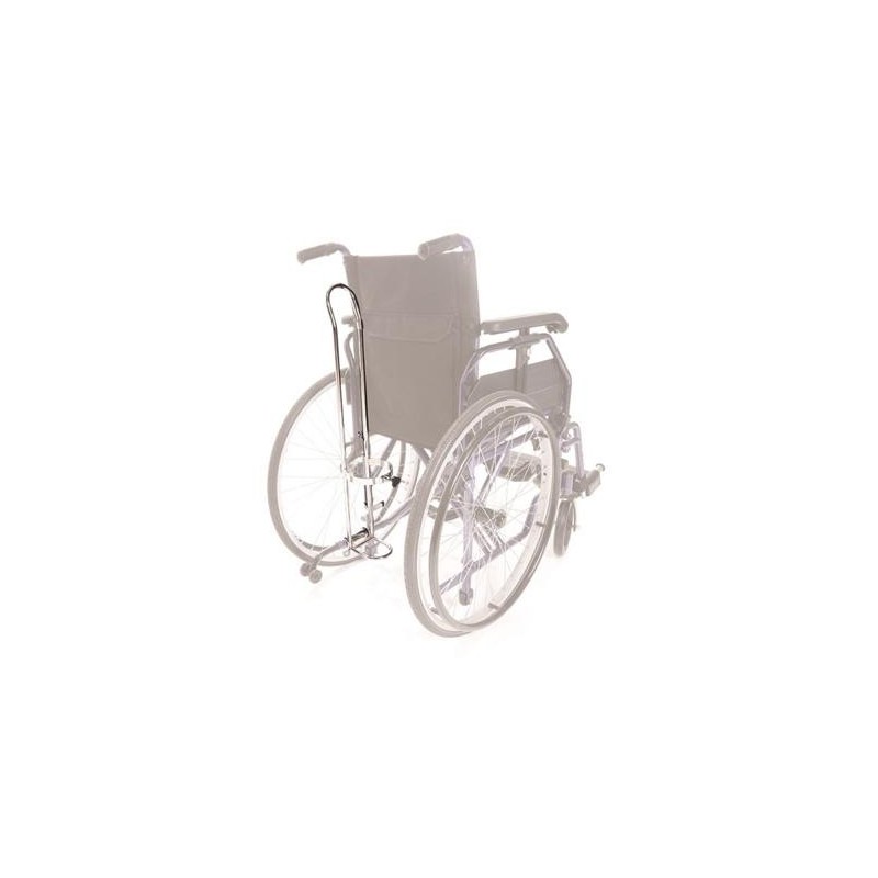 Portabombole per carrozzine Moretti. Realizzato in acciaio cromato, è utile per il trasporto di bombole d'ossigeno. Diametro massimo della bombola: 120 mm.