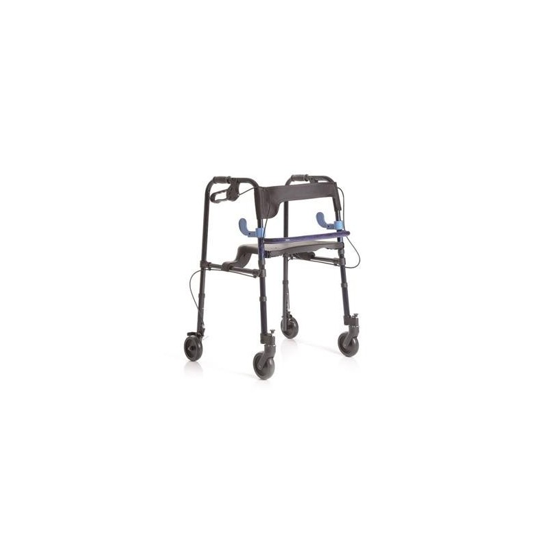 Con impugnature imbottite anatomiche. Regolabile in altezza ogni 2,5 cm. Sedile ribaltabile fissato alle barre anteriori con appoggio sui traversini laterali schienale in stoffa.