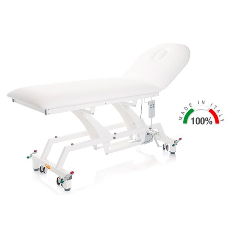 Lettino con altezza regolabile elettricamente e schienale regolabile manualmente con cremagliera da 0°-60°.