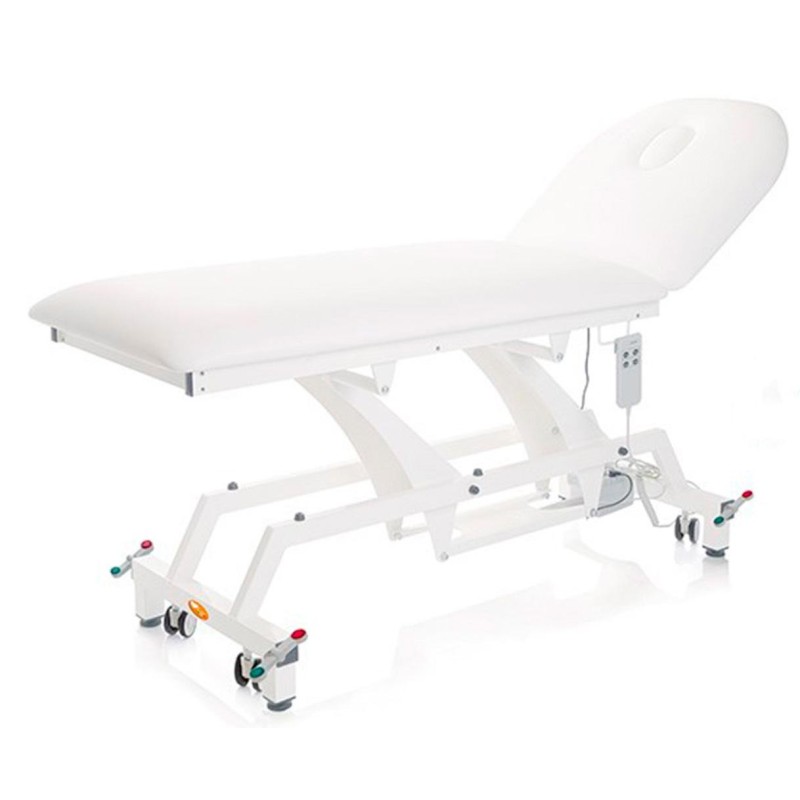 Lettino con altezza e schienale regolabili elettricamente 0°-60°. Struttura in tubolare di acciaio verniciato bianco. Imbottitura in poliuretano densità 25 alta 8 cm. Rivestimento in similpelle lavabile, autoestinguente Classe 1 IM di resistenza al fuoco. Completo di foro facciale. Con ruote. Inclinazione schienale a gas.
